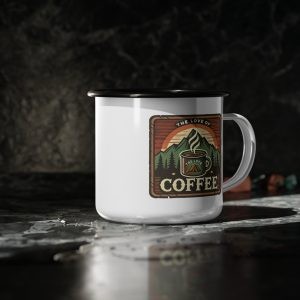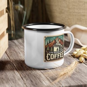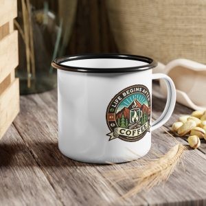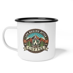 “Life Begins After Coffee” Enamel Camp Cup Round Graphic
