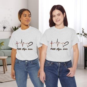 The "Believe Cross" embroidery graphic T-shirt showcases a beautifully crafted design...