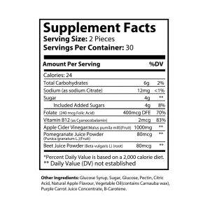 The Apple Cider Vinegar Gummies (60 Gummies) are a tasty and convenient way to support your exercise performance and overall wellness. Formulated with a powerful blend of key ingredients—including Apple Cider Vinegar, Pomegranate Juice Powder, Beet Juice Powder, Folate, and Vitamin B12—these gummies are designed to help boost energy, metabolism, and endurance. With added sodium for electrolyte support, they provide a well-rounded formula ideal for active lifestyles. Packaged in FDA-registered and GMP-certified facilities, each batch undergoes rigorous third-party lab testing for quality and safety. Non-GMO, vegan-friendly, vegetarian, and corn-free, these gummies are a flavorful, health-boosting supplement you can feel good about taking daily. **Please note: This product is shipped only to the United States and their territories.** Ingredients: Sodium (as sodium Citrate), Sugar, Folate (240 mcg Folic Acid), Vitamin B12 (as Cyanocobalamin), Apple Cider Vinegar(Malus pumila mill)(Fruit), Pomegranate Juice Powder (Punica granatum L.)(Fruit), Beet Juice Powder (Beta vulgaris L) (root). Other Ingredients: Glucose Syrup, Sugar, Glucose,Pectin, Citric Acid, Natural Apple Flavour, Vegetable Oil(contains Carnauba wax), Purple Carrot Juice Concentrate, B-Carotene.