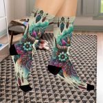Step into comfort and style with our β€œBull Skull Boho Print V.4” Print Cushioned Crew Socks, designed to deliver both durability and a cozy fit. Made from a premium blend of materials, these socks consist of 73% polyester for durability, 18% nylon for stretch and breathability, 3% cotton for softness, and 6% spandex for flexibility, ensuring a comfortable fit for a wide range of foot sizes, from women’s size 5 US up to men’s size 12 US. Β Do not dry clean, do not iron, do not tumble dry, do not bleach, Machine wash: cold (max 30C or 90F). The 200-needle knit construction provides a high-density, smoother surface that not only looks great but feels superior as well. Each sock features a cushioned bottom that enhances comfort by absorbing the impact of your steps, making them perfect for extended wear, whether you’re hitting the gym, going for a run, or simply lounging at home. Embrace the perfect blend of function and comfort with these versatile, all-day wear crew socks.