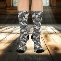 Step into comfort and style with our Gray Camo Print Cushioned Crew Socks, designed to deliver both durability and a cozy fit. Made from a premium blend of materials, these socks consist of 73% polyester for durability, 18% nylon for stretch and breathability, 3% cotton for softness, and 6% spandex for flexibility, ensuring a comfortable fit for a wide range of foot sizes, from women’s size 5 US up to men’s size 12 US.  Do not dry clean, do not iron, do not tumble dry, do not bleach, Machine wash: cold (max 30C or 90F). The 200-needle knit construction provides a high-density, smoother surface that not only looks great but feels superior as well. Each sock features a cushioned bottom that enhances comfort by absorbing the impact of your steps, making them perfect for extended wear, whether you’re hitting the gym, going for a run, or simply lounging at home. Embrace the perfect blend of function and comfort with these versatile, all-day wear crew socks.