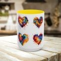 Brighten your day and infuse a little love into every sip with our enchanting “Hearts” ceramic coffee mug. This beautifully designed mug is available in two sizes—11oz and 15oz—and features a delightful hearts pattern, making it a perfect addition to your morning coffee or afternoon tea ritual. The “Hearts” design consists of a charming array of hearts in various styles and shades. Crafted from durable white ceramic, this mug is built to last and is offered with eight vibrant options for the interior and handle, allowing you to personalize your mug or coordinate with your existing kitchenware. The sturdy C-handle provides a comfortable grip, enhancing your beverage experience whether at home or in the office. Ideal for those who cherish romantic or heart-themed designs, this mug not only brightens your day but also makes a thoughtful gift for loved ones, expressing affection and warmth with every use.