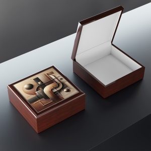 Secure and showcase your treasures in our elegantly crafted rubberwood jewelry box, enhanced with a distinctive “Modern Abstract Art” V.1 graphic ceramic tile on the lid. This stylish jewelry box is available in three sophisticated finishes—Golden Oak, Red Mahogany, and Ebony Black—each providing a unique backdrop for the vibrant 6″ x 6″ glossy graphic tile that adorns the top. The box itself is constructed from high-quality rubberwood, known for its durability and beautiful grain, and finished with a glossy varnish that adds a luxurious shine. It features dual hinges that lock at a 90-degree angle to ensure the lid stays open while you browse your collection, making it both functional and secure. The interior is lined with soft felt material to protect your jewelry from scratches and damage. Whether placed on a dresser, vanity, or shelf, this jewelry box combines functionality with artistic flair, making it an exceptional choice for safeguarding your precious items while adding a touch of custom style to your decor.